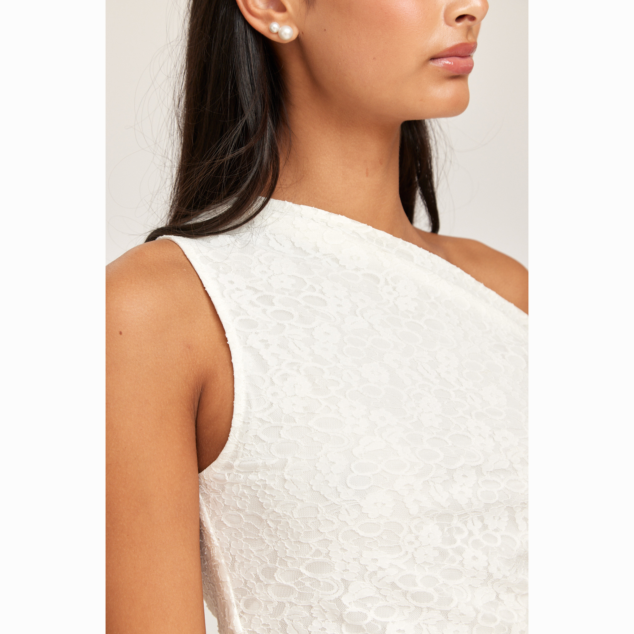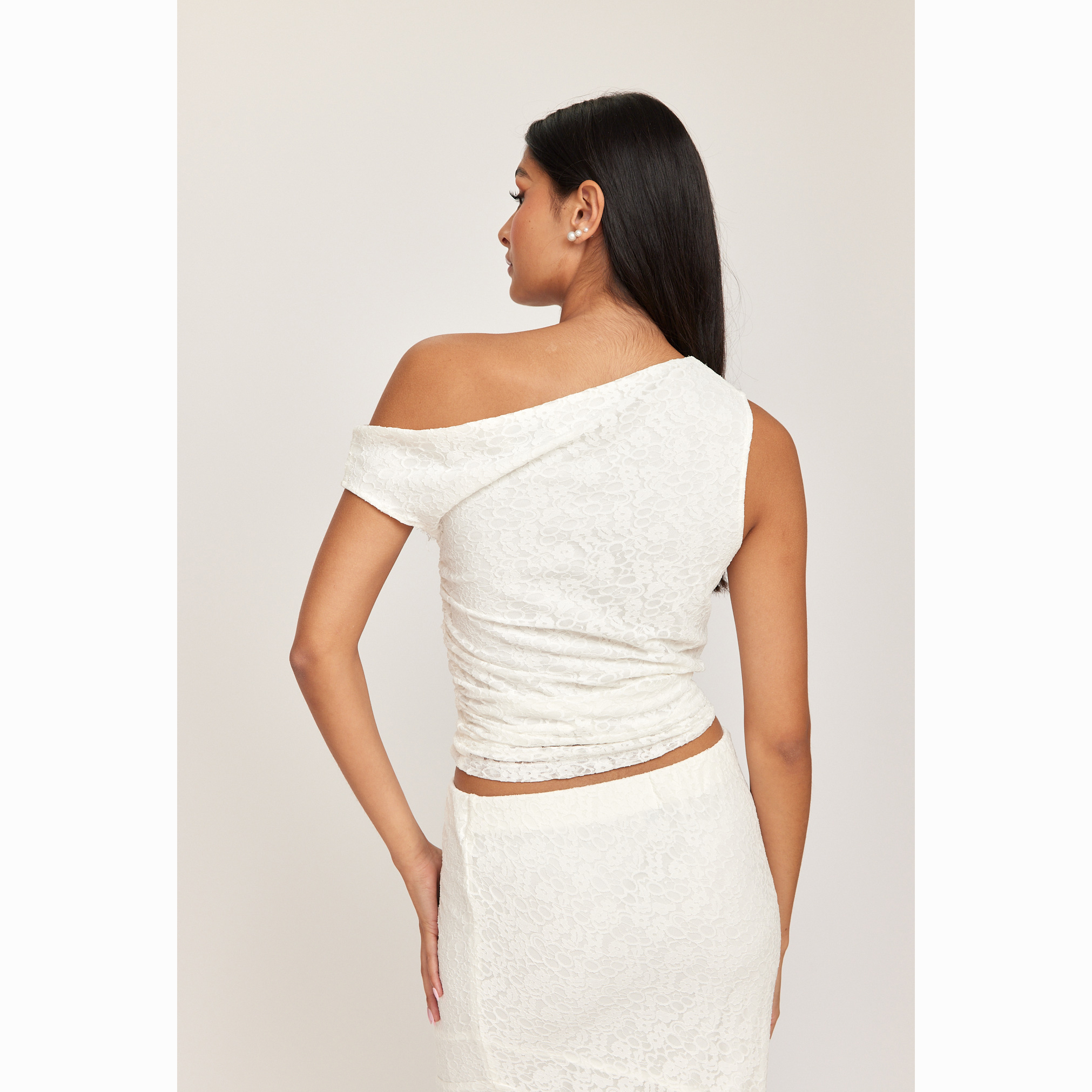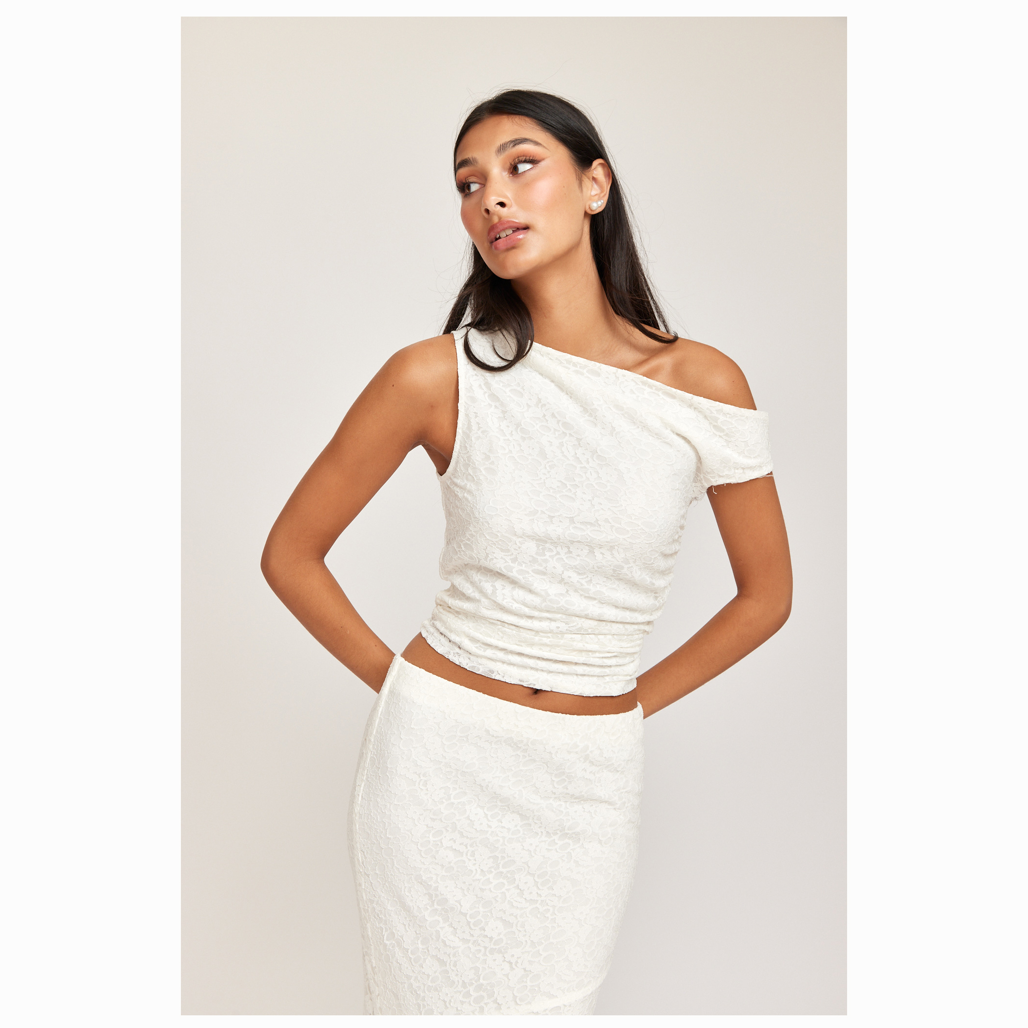 Detta är en snygg topp med en axel tillverkad av ett fint spetstyg i en krispig krämfärg. Den har en lätt rynkad detalj för en smickrande passform och ger en asymmetrisk touch till din look. Perfekt att kombinera med högmidjade kjolar eller skräddarsydda byxor, denna topp är idealisk för speciella tillfällen eller en elegant avslappnad outfit.