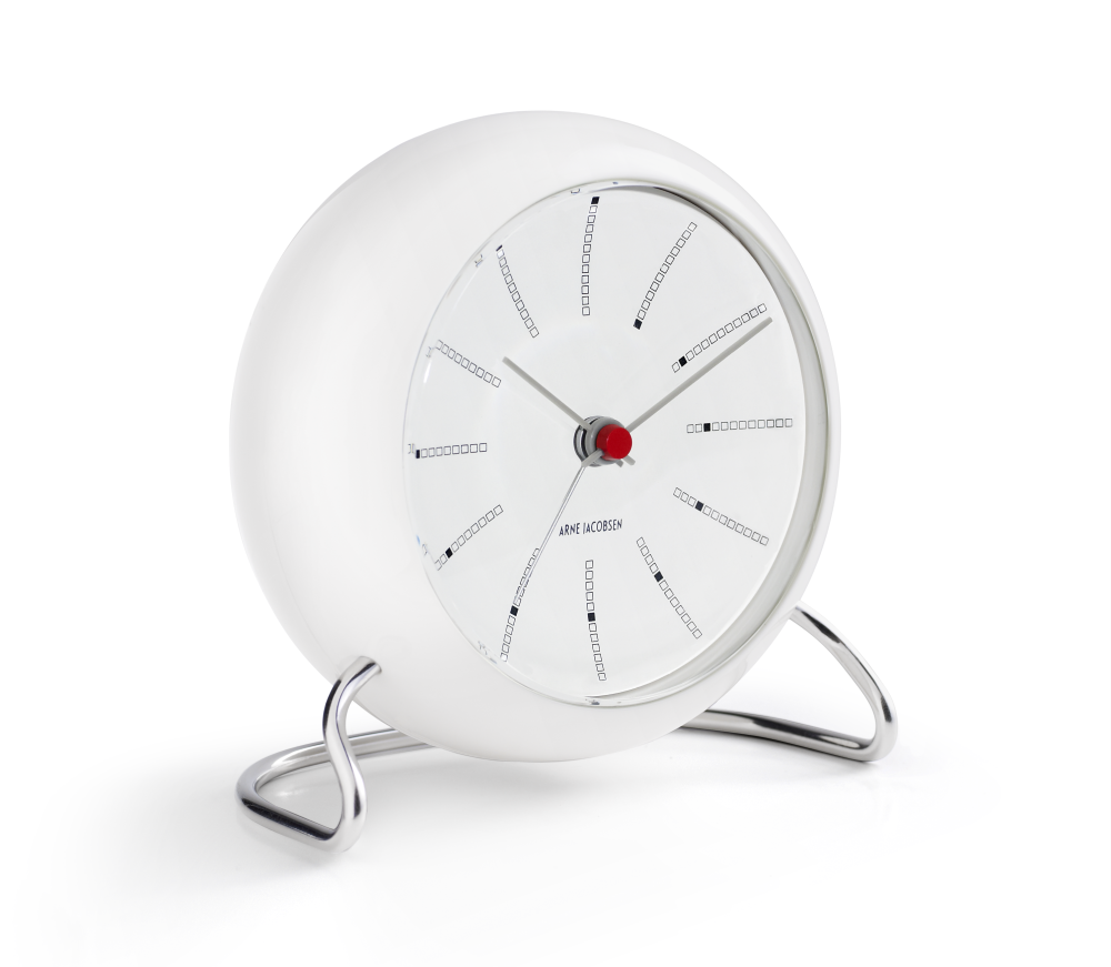 Den världsberömda arkitektens bordsur med alarm skapades 1939. Det grafiska utseendet och metallfoten med tydlig inspiration från stolarna Myran och Sjuan gör uret till en given presentidé för designälskare. Uret passar överallt i det moderna hemmet och med de uppdaterade funktionerna snooze och ljussensor är det ett effektivt väckarur på sängbordet.