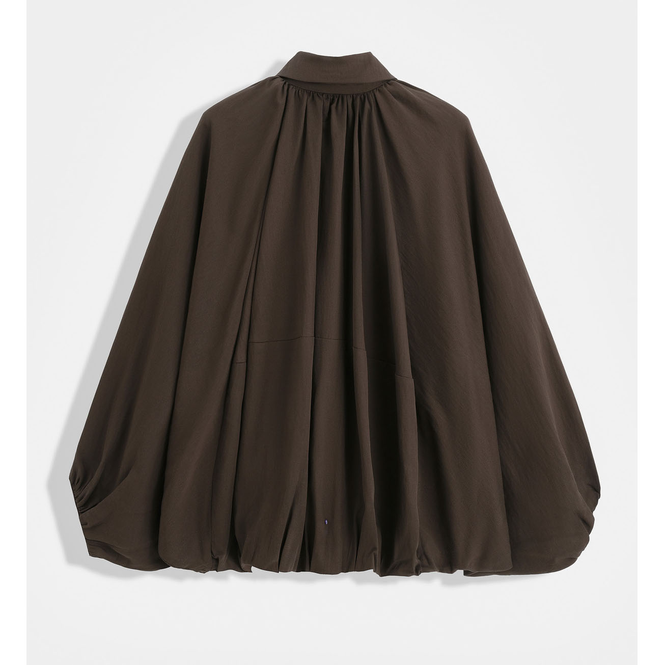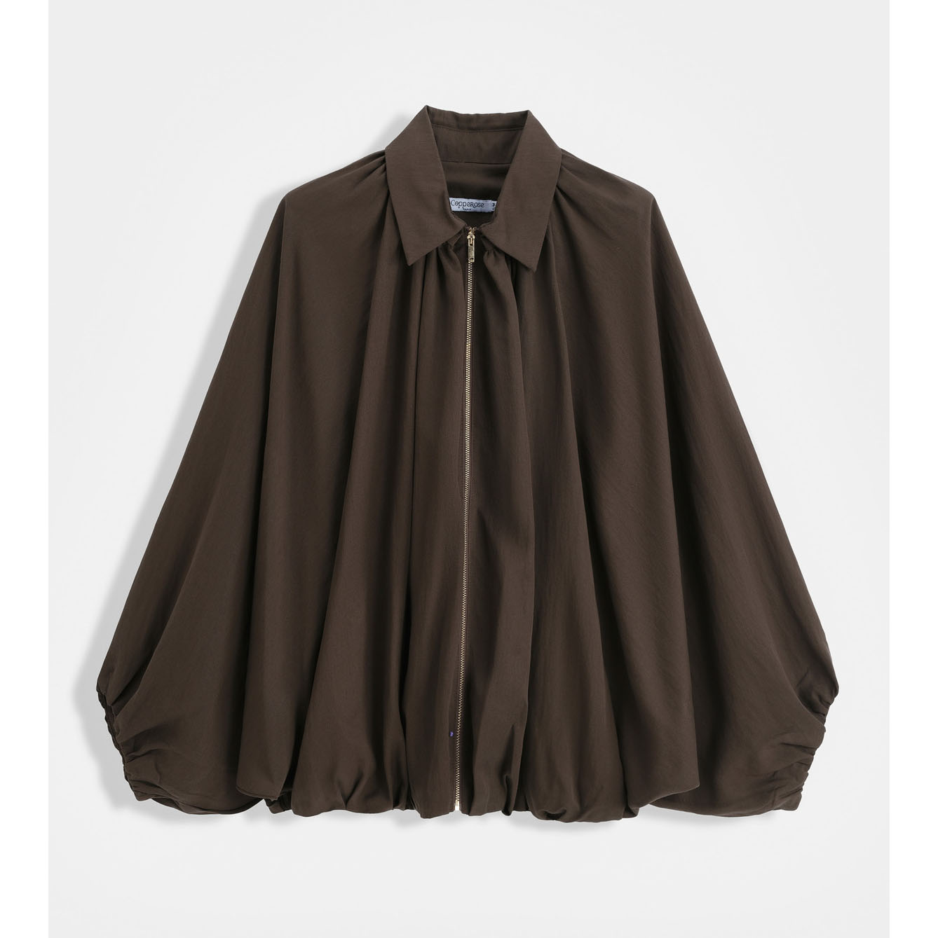 Bomberjacka tillverkad av en lyocellblandning. Vikkrage och långa puffärmar. Mer volym nedtill. Dragkedja fram. Framfickor infällda i sömmen.