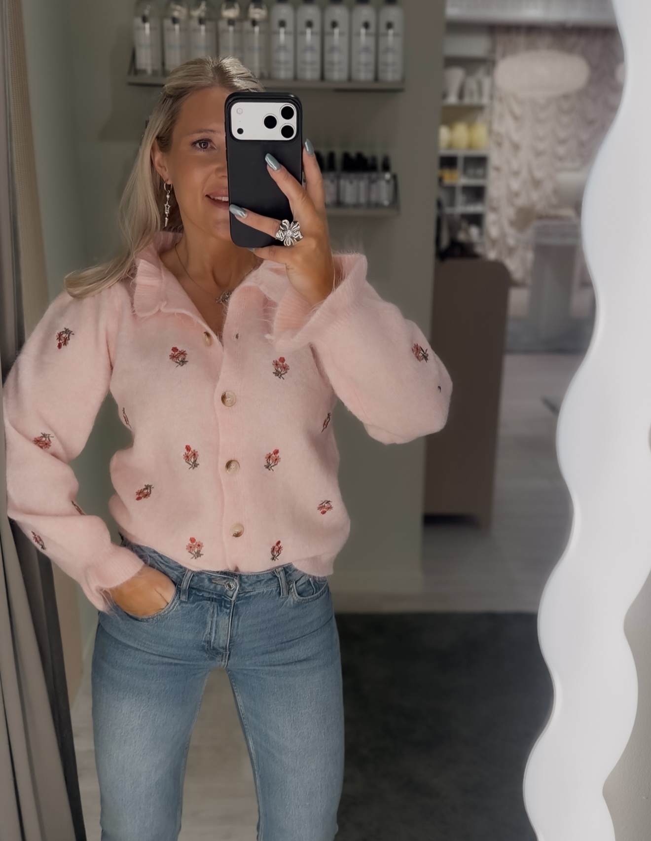 Sötaste koftan av mjuk och lätt stickning, den sticker ut med sina fina blommiga broderier utspridda över hela designen, vilket ger en raffinerad och tidlös touch.
