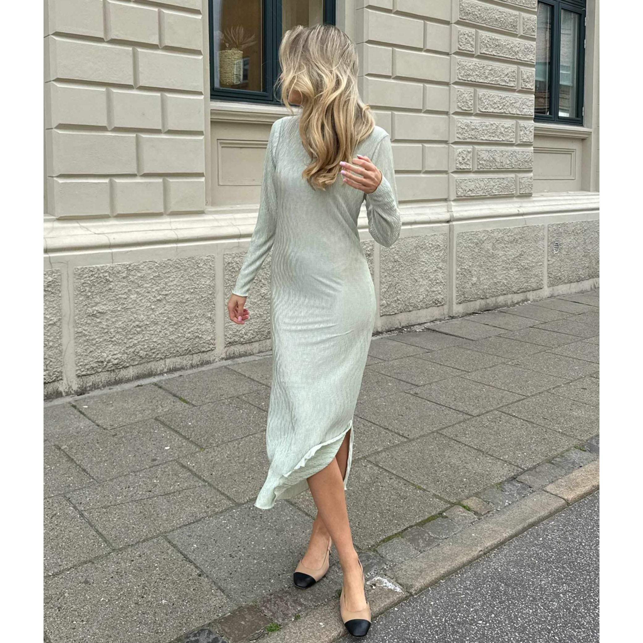 Vacker plisséklänning i ljusgrönt. Klänningen har långa ärmar och rund halsringning, båda prydda med fina volangdetaljer. Den har slitsar på båda sidor, vilket ger designen en elegant touch.