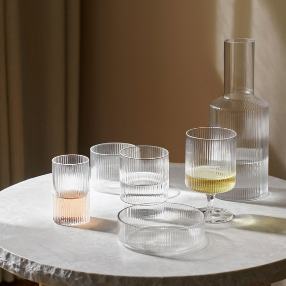 Material: Tillverkade av munblåst glas i en räfflad form. Små bubblor kan förekomma.