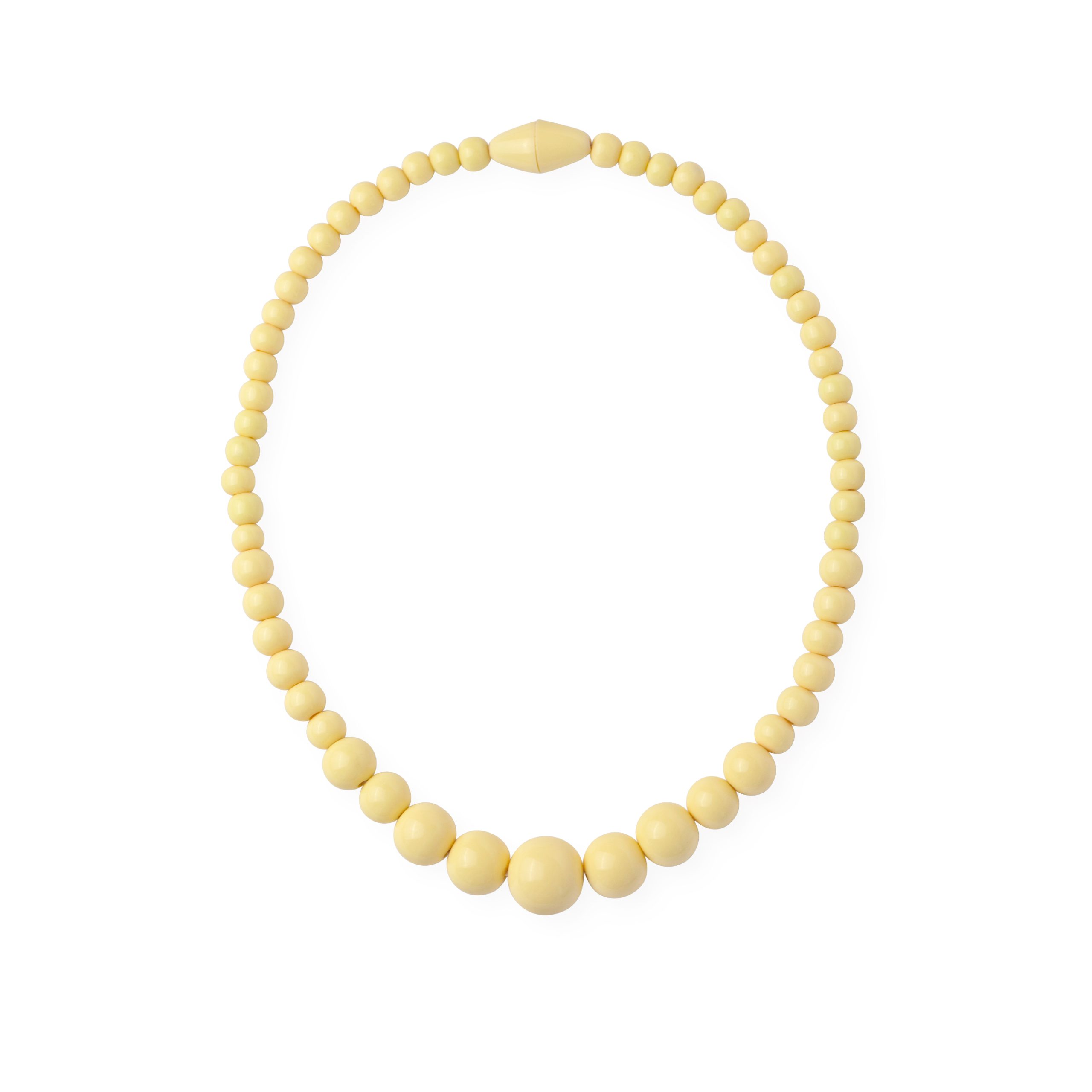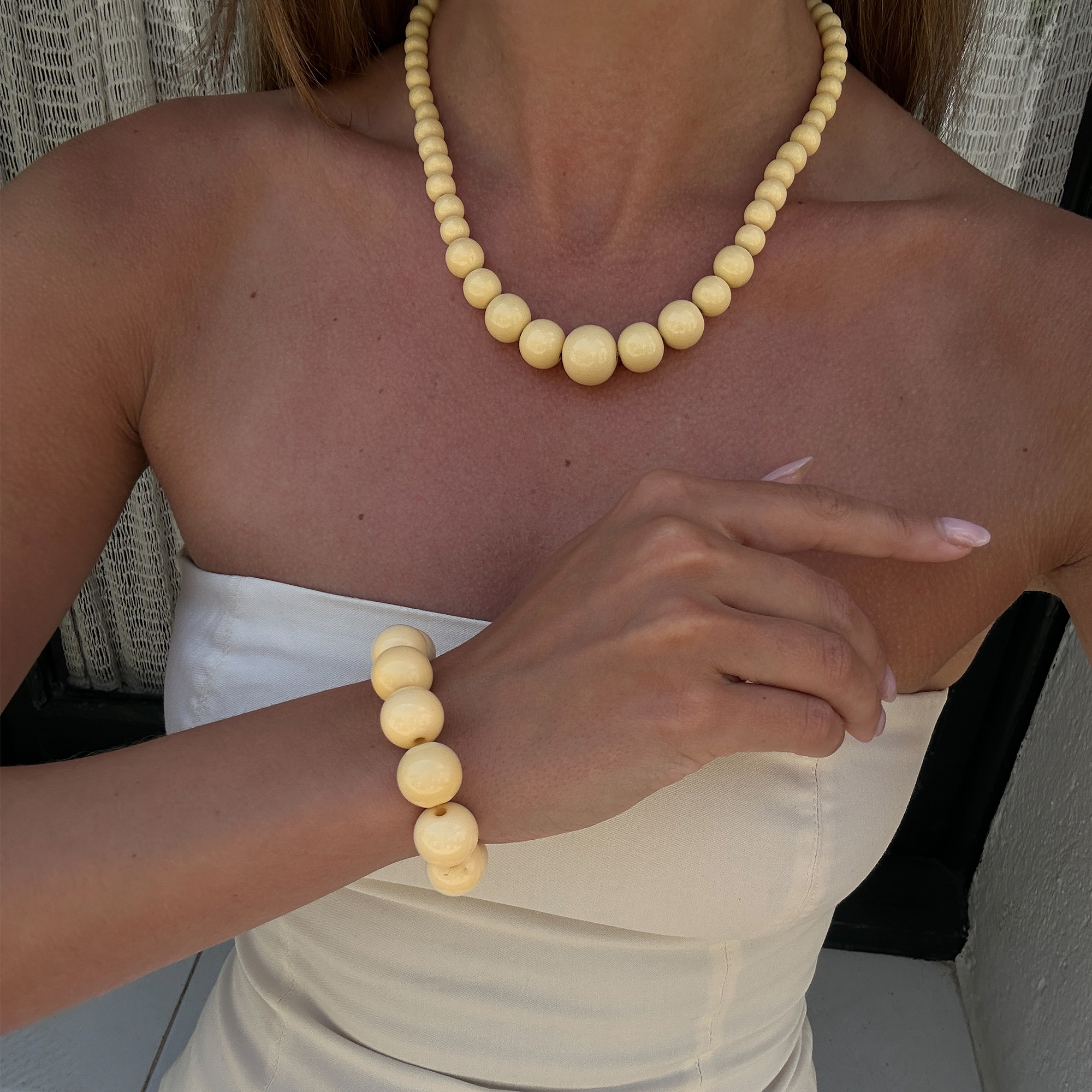 Den släta ytan på pärlorna ger ett stilrent uttryck, samtidigt som den smörgula färgen tillför ett mjukt och personligt inslag. Halsbandet kan bäras ensamt som en tydlig detalj eller kombineras med andra smycken för en mer personlig stil.