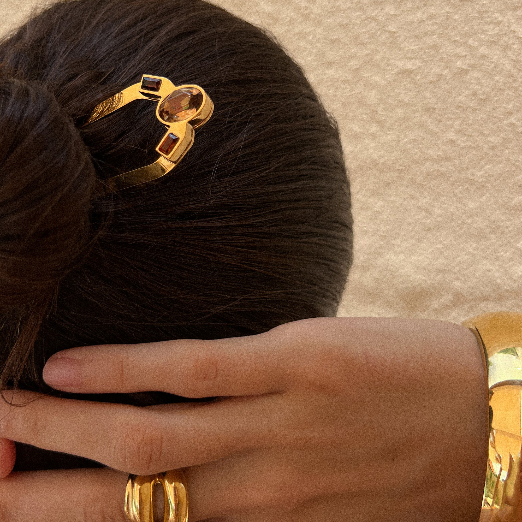 French Hair Pin Brown är en praktisk och stilren håraccessoar som håller håret säkert på plats samtidigt som den tillför en fin detalj. Den har en klassisk böjd form och är dekorerad med tre små bruna zirkoniastenar längs ovansidan. Stenarna ger en mjuk glans som smälter in naturligt med olika frisyrer och klädstilar.