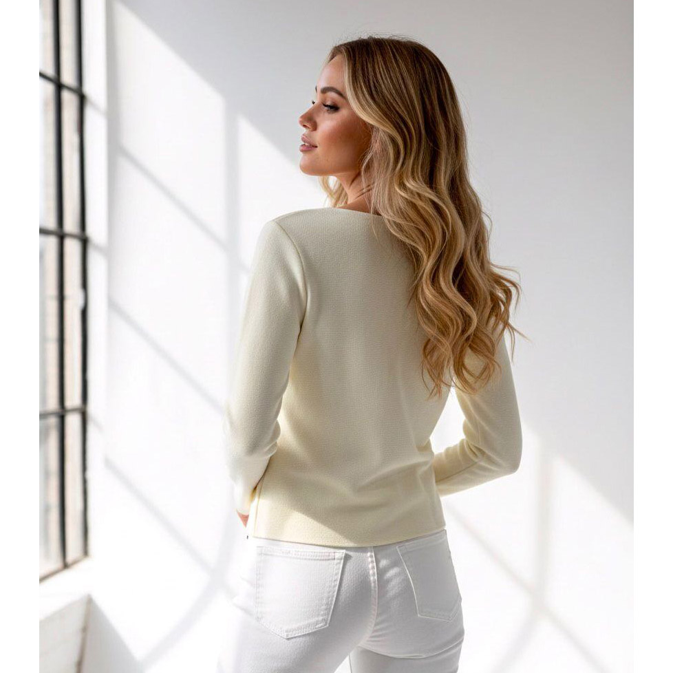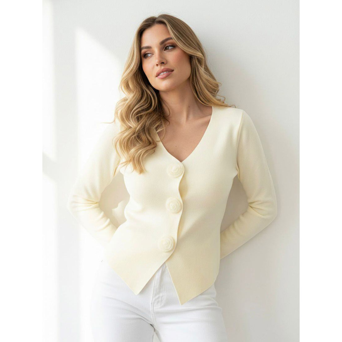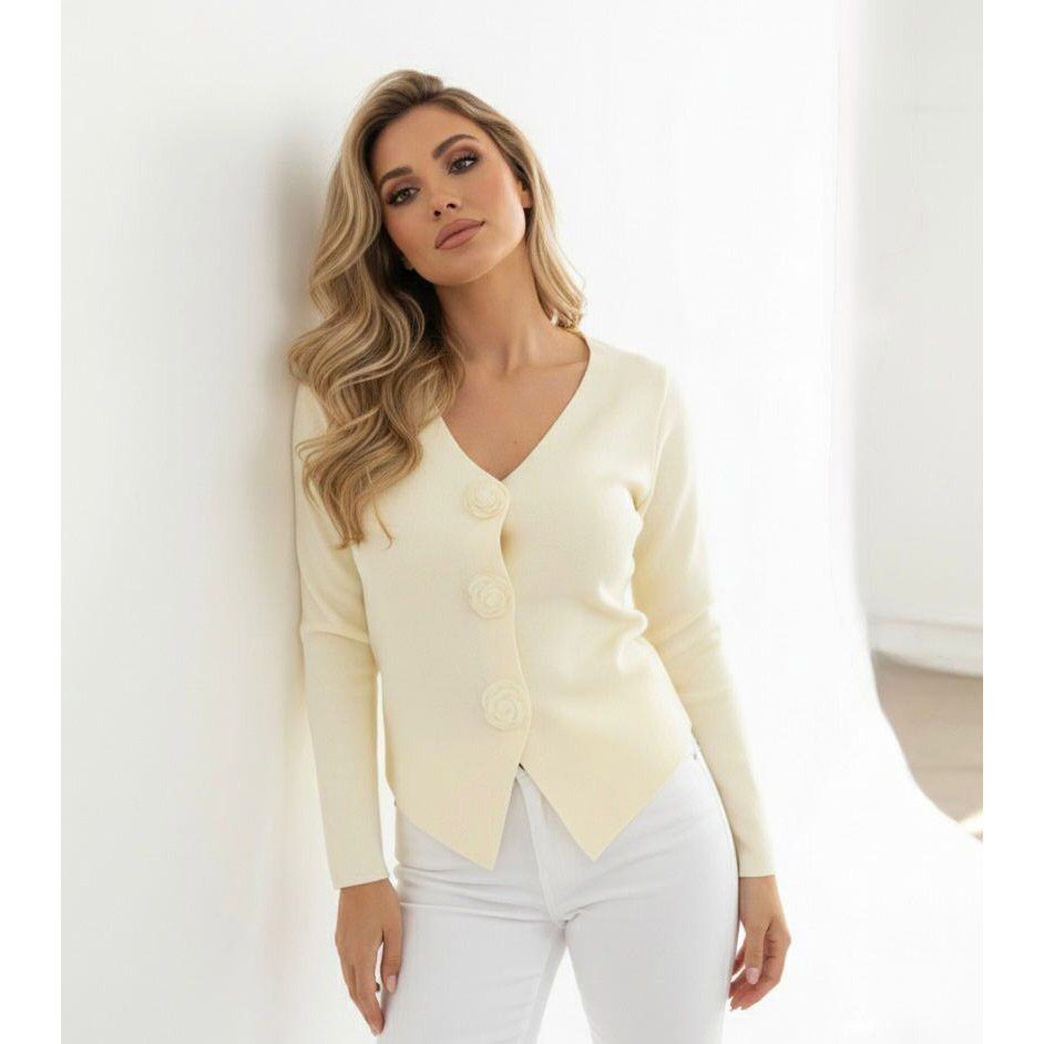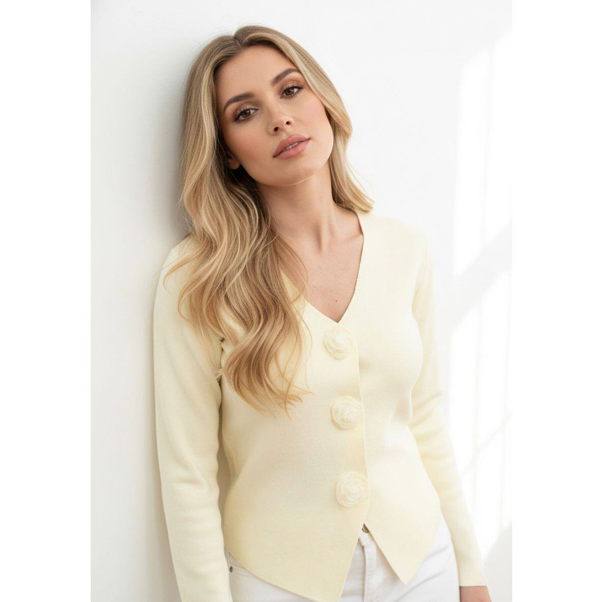 Kort stickad kofta med skräddarsydd passform, designad för att erbjuda en feminin och raffinerad look. Knäppningen framtill är prydd med dekorativa blomformade knappar, vilket ger en delikat och sofistikerad touch. Långa ärmar och mjuk stickning säkerställer komfort och passform, samtidigt som de harmoniskt framhäver silhuetten. Ett elegant och mångsidigt plagg, perfekt för att skapa en elegant vardagsoutfit eller komplettera en mer uppklädd look med finess.