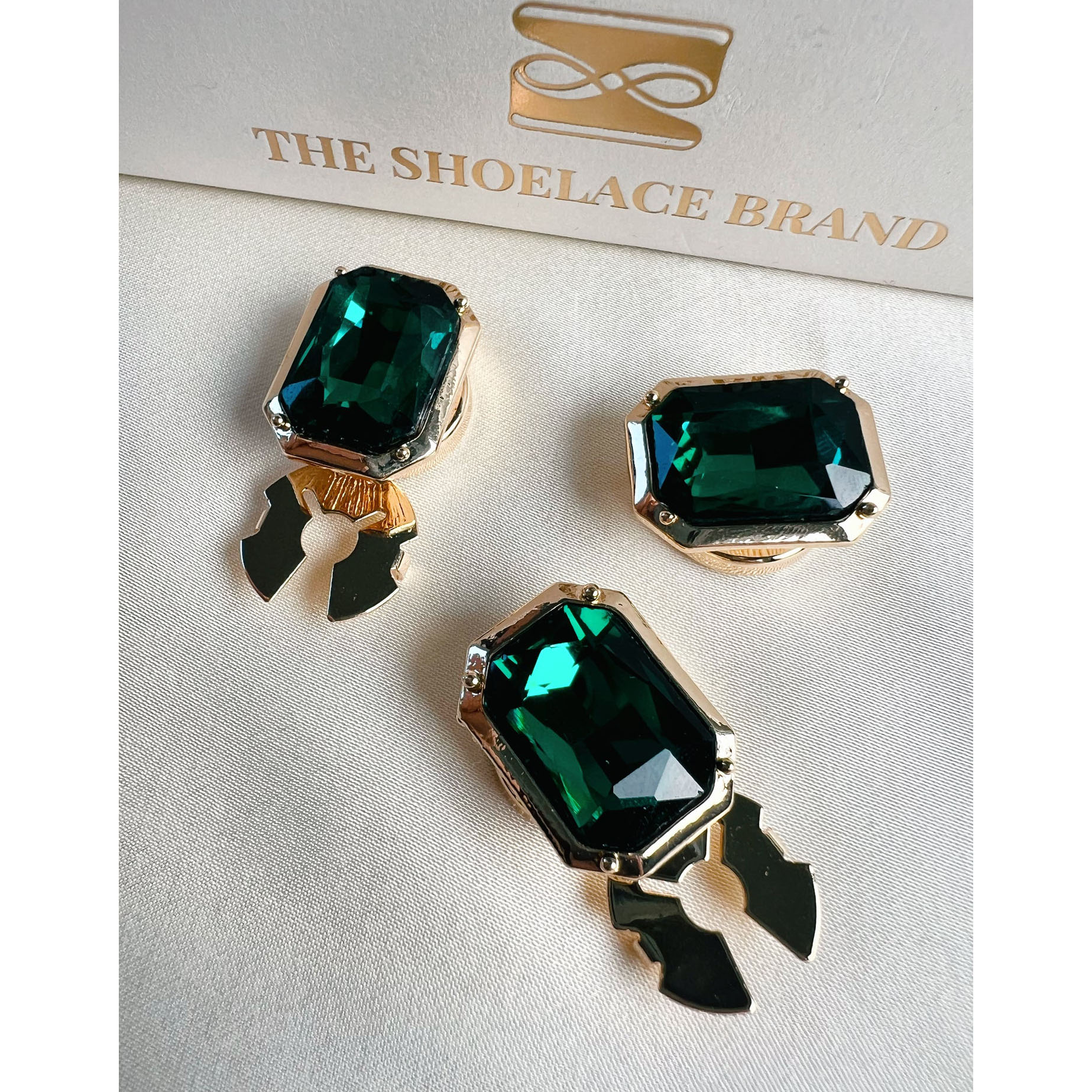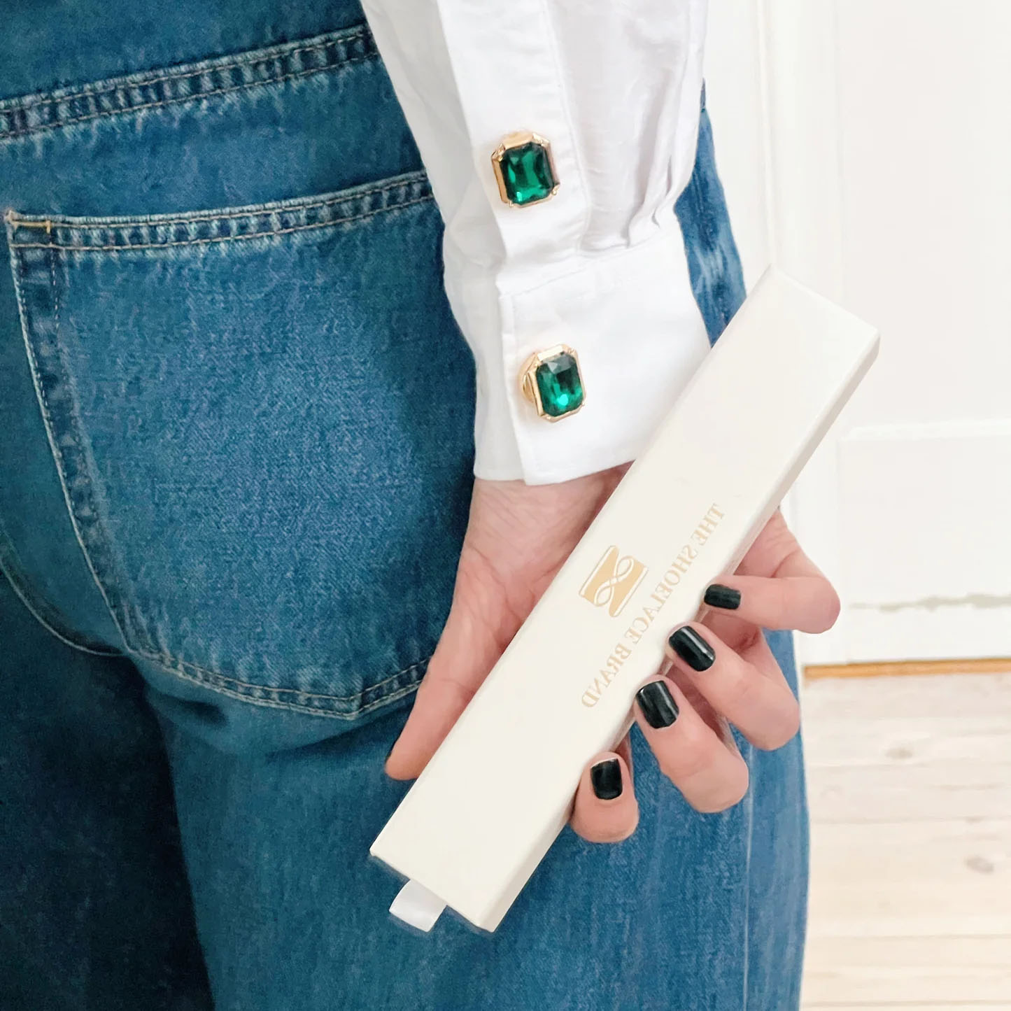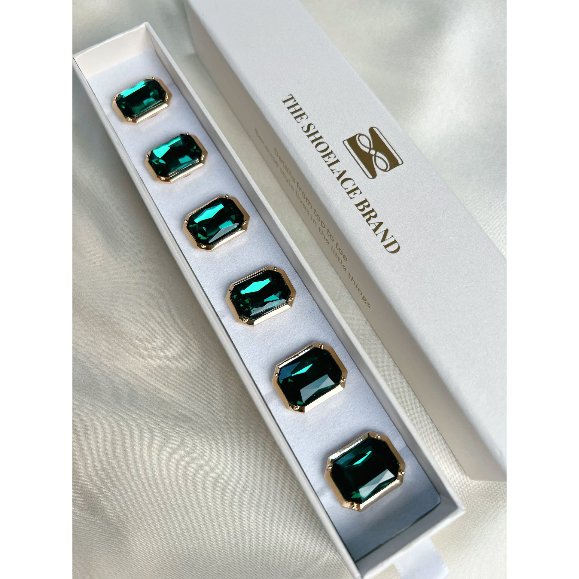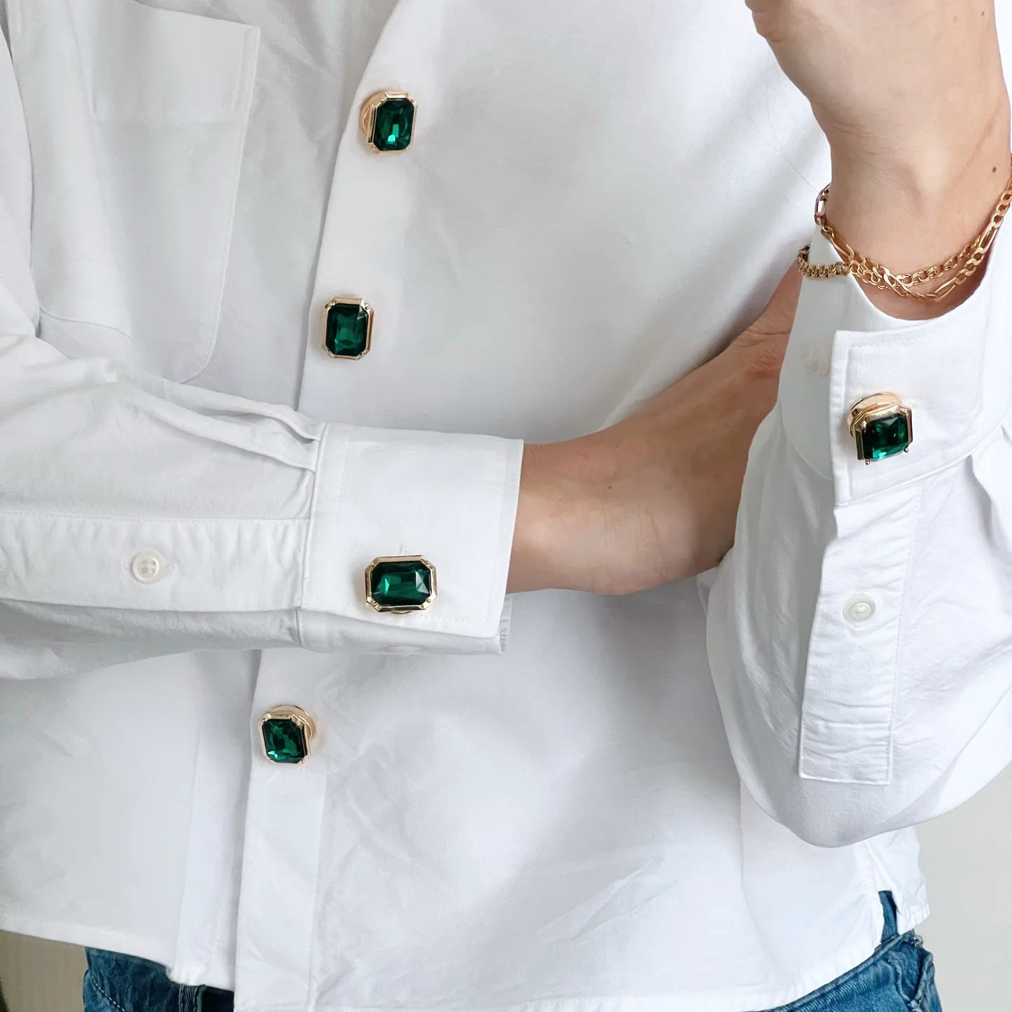 Nea är en rektangulär knappcharm med guldfärgat underrede och en smaragdgrön, facetterad kristall. Formen är grafisk och tydlig, medan färgen tillför djup och elegans. En modern detalj som känns både sofistikerad och harmonisk.